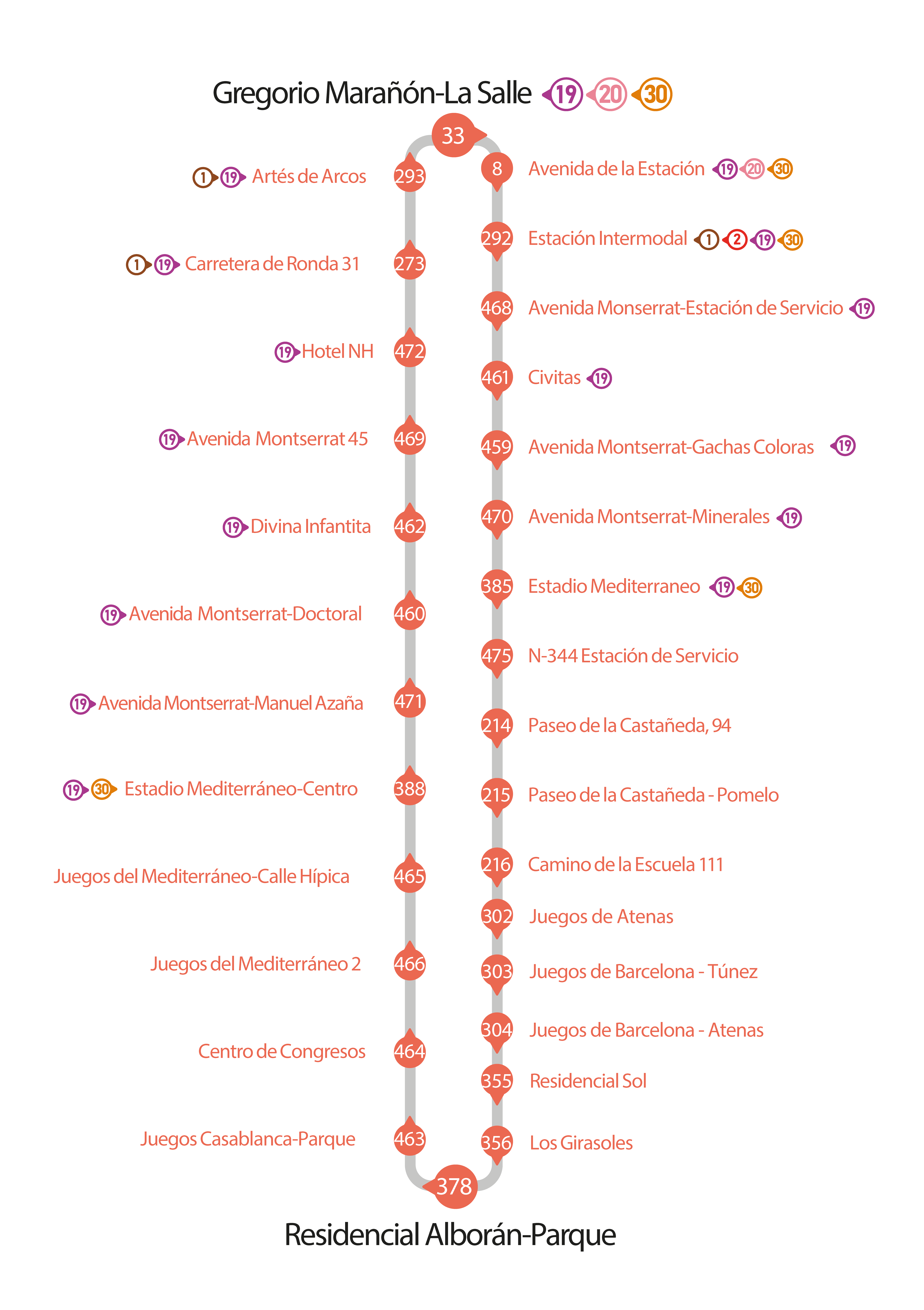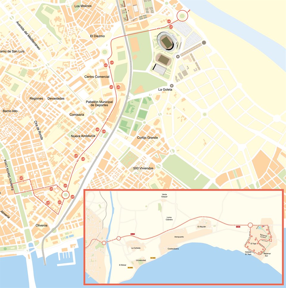 • Entrará al Residencial Alborán por Avda. Castañeda y saldrá por Avda. Juegos del Mediterráneo.